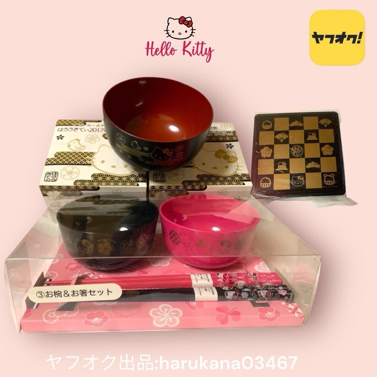 > 未使用 Hello Kitty ハローキティ お椀 & お箸セット ブラック ピンク 320ml/新春 干支 お椀 2個 鳥/おまけ お重箱 和風 和柄 サンリオ