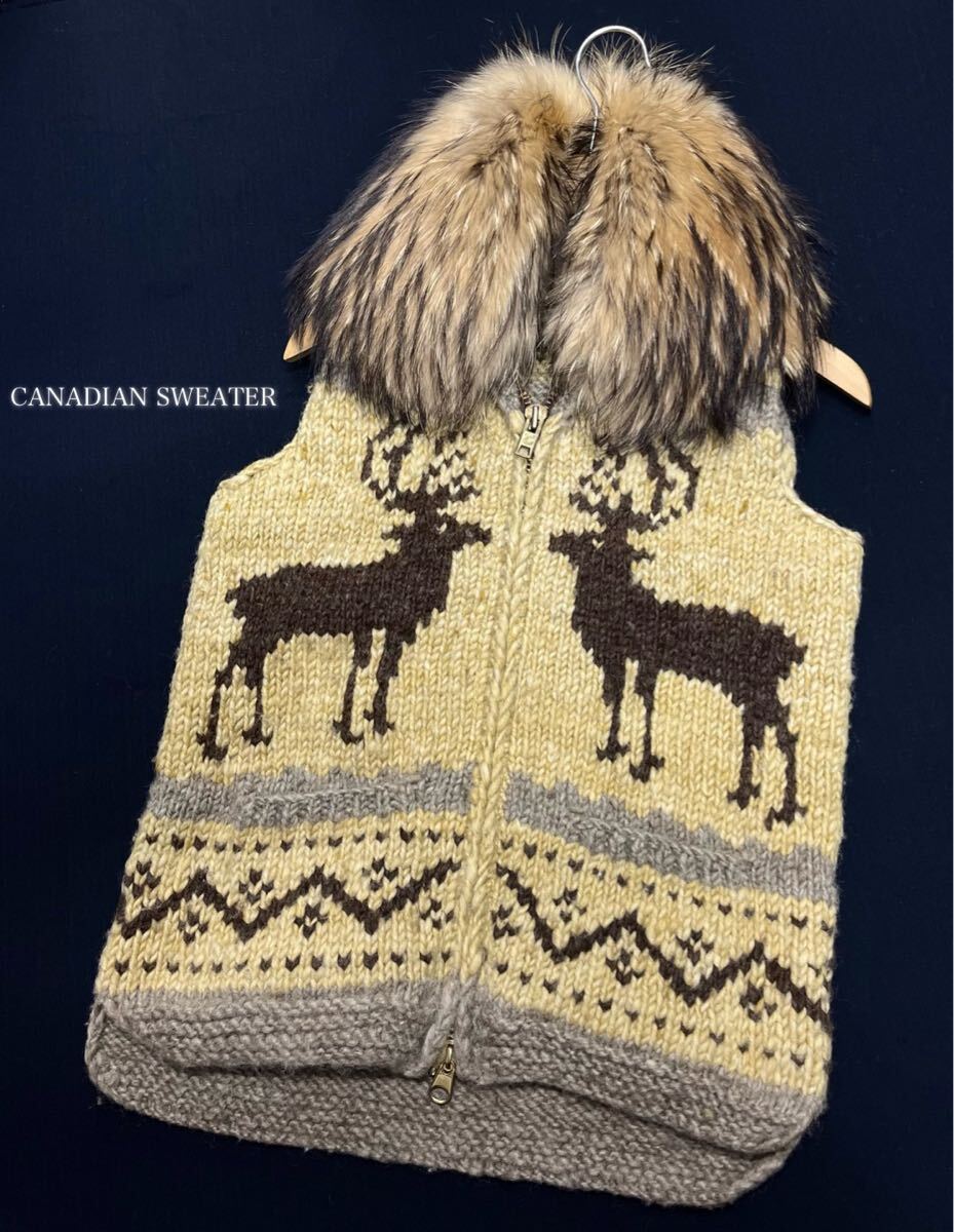 > CANADIAN SWEATER★カナディアンセーター ★カナダ製 厚手 ウール100% ニット カウチン ベスト フィンラクーンファー襟付