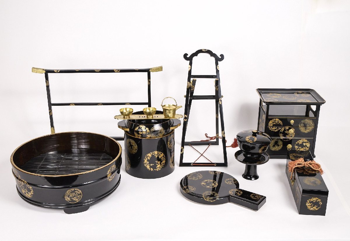 ・大名家調度品 松竹梅蒔絵 化粧道具 木箱 /お歯黒道具6点蒔絵耳盥 台輪 彫金真鍮4点