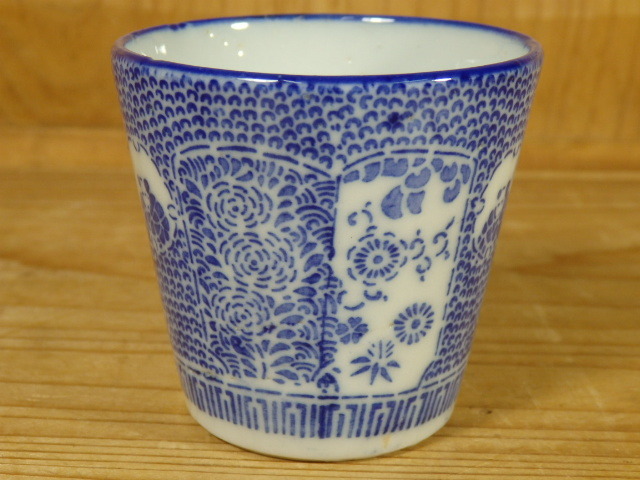 - ◆蕎麦猪口:2:◆『微塵櫛高台:窓絵花文様:雪輪唐子』◆べた底◆明治印判◆型紙摺絵◆会津本郷焼◆