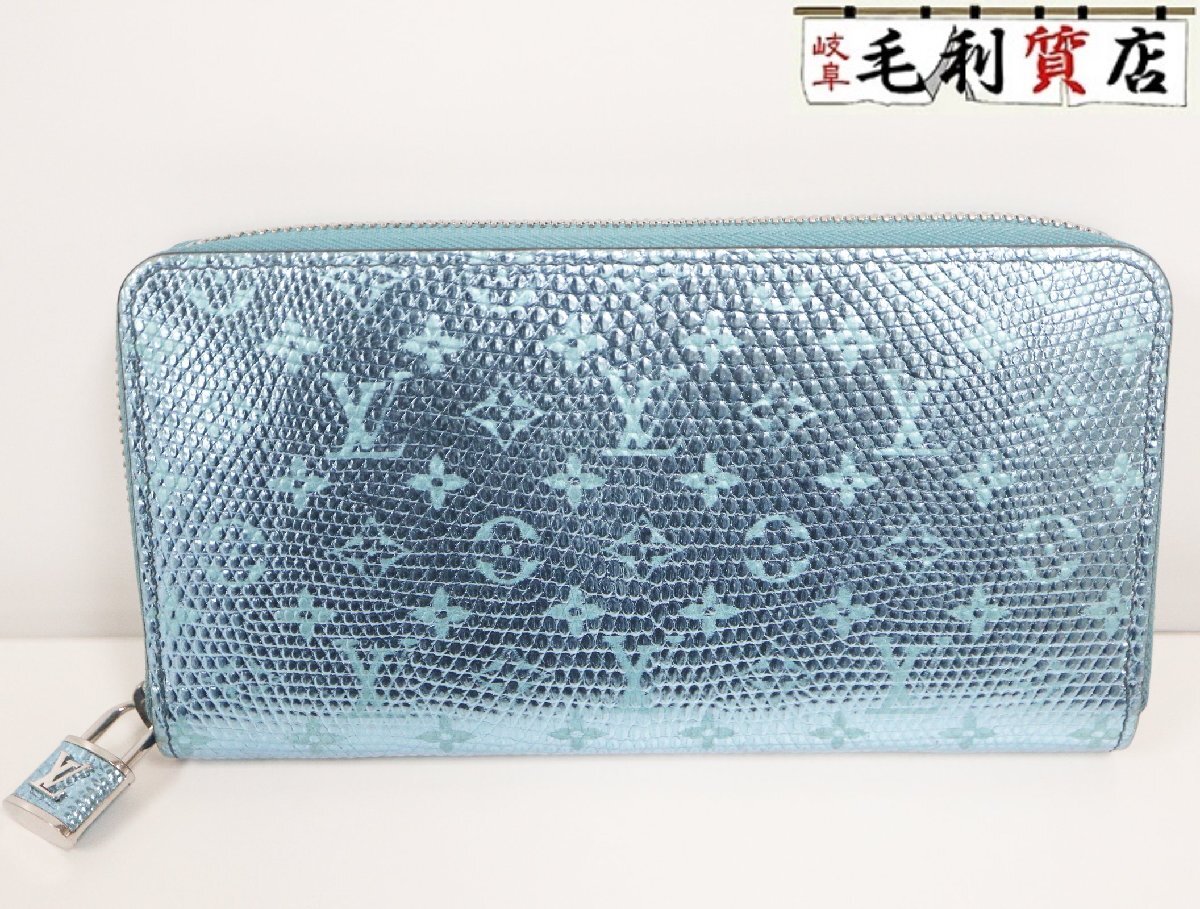 > ルイヴィトン LOUIS VUITTON ジッピー ウォレット モノグラム N81277 リザード メタライズド ブルー シルバー金具 長財布 メンズ 財布