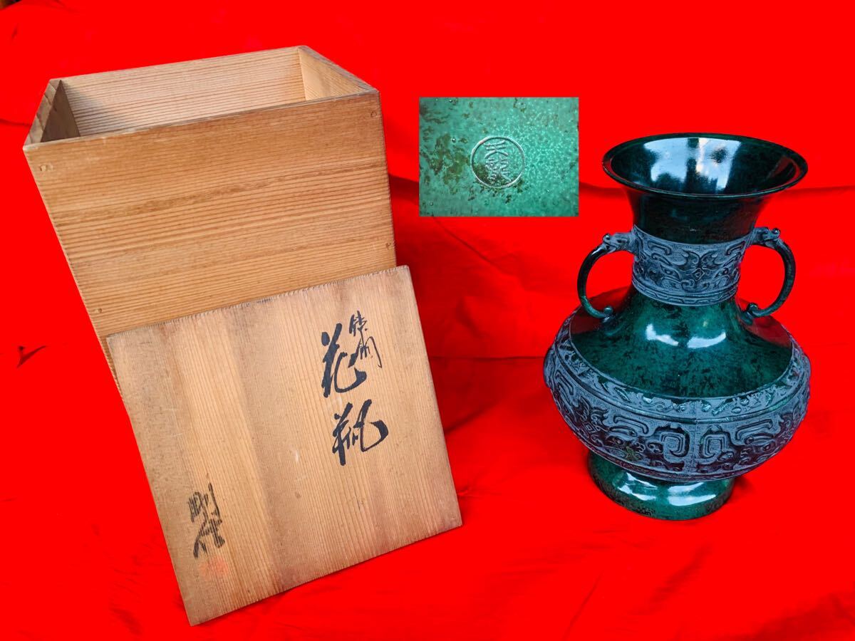 - ★天龍 剛信 花瓶 双耳花瓶 鋳銅 唐鋼 青銅 中国 古玩 唐物 饕餮文 壺 花器 骨董 未使用 共箱付 昭和 当時物 ヴィンテージ★