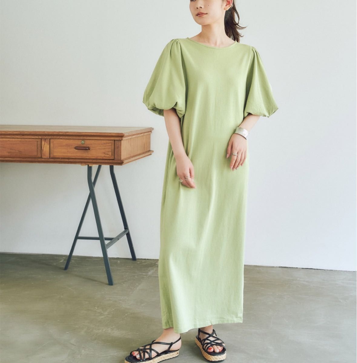 - titivate半袖ワンピースライトグリーン 黄緑色 グリーン ロングワンピース ボリューム袖