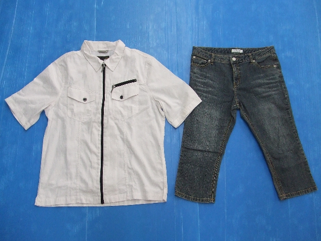 - 【お買得!】★メンズカジュアル上下/LLサイズセット★①半袖シャツ/白/ジップアップ②J-honey/ひざ丈デニムパンツ