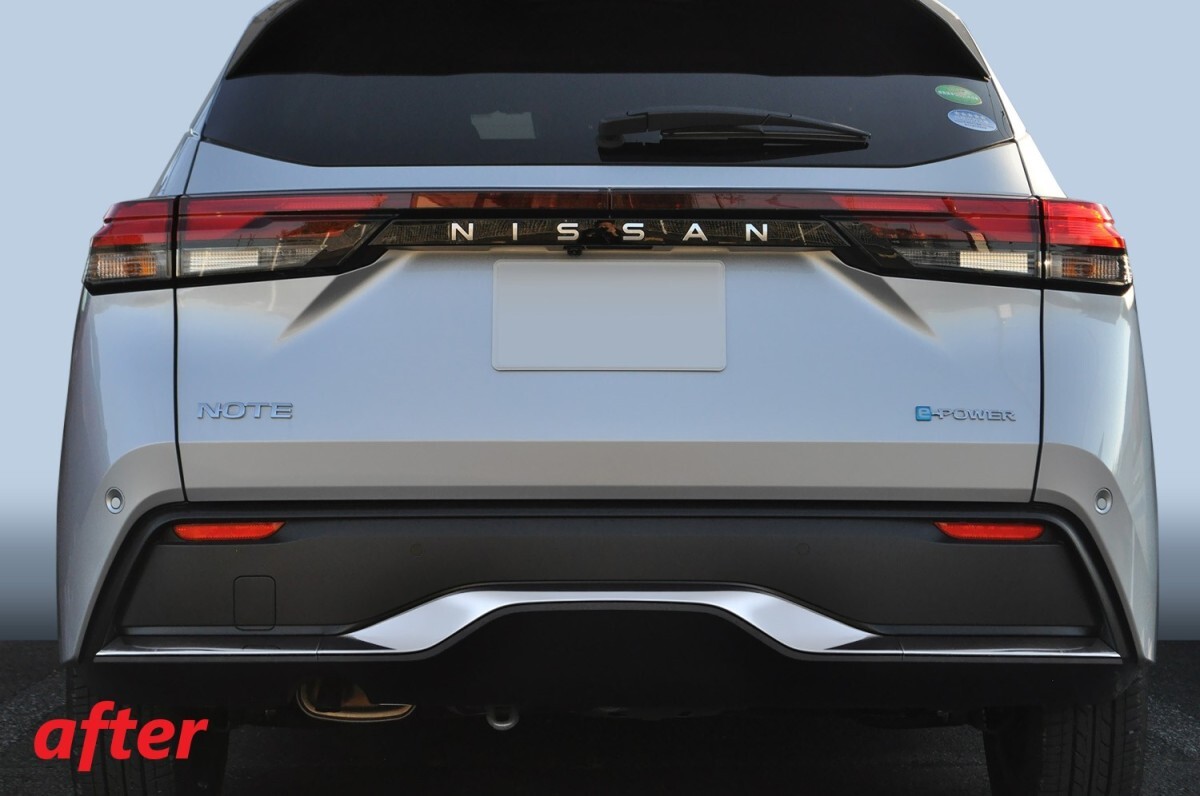 - E13 ノート リアバンパーガーニッシュ 送料込み クローム ガラスコーティング施工済み