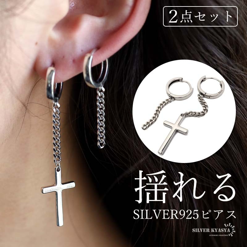 - シルバー925 ドロップピアス 揺れる クロスピアス チェーンピアス フープピアス 2点セット シルバー 十字架 両耳 金アレ対応
