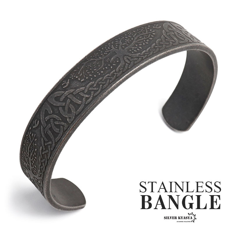 > ステンレス ブラック ケルト文様バングル ユグドラシル メンズ 平打ちバングル ブレスレット 腕輪 黒 金属アレルギー対応