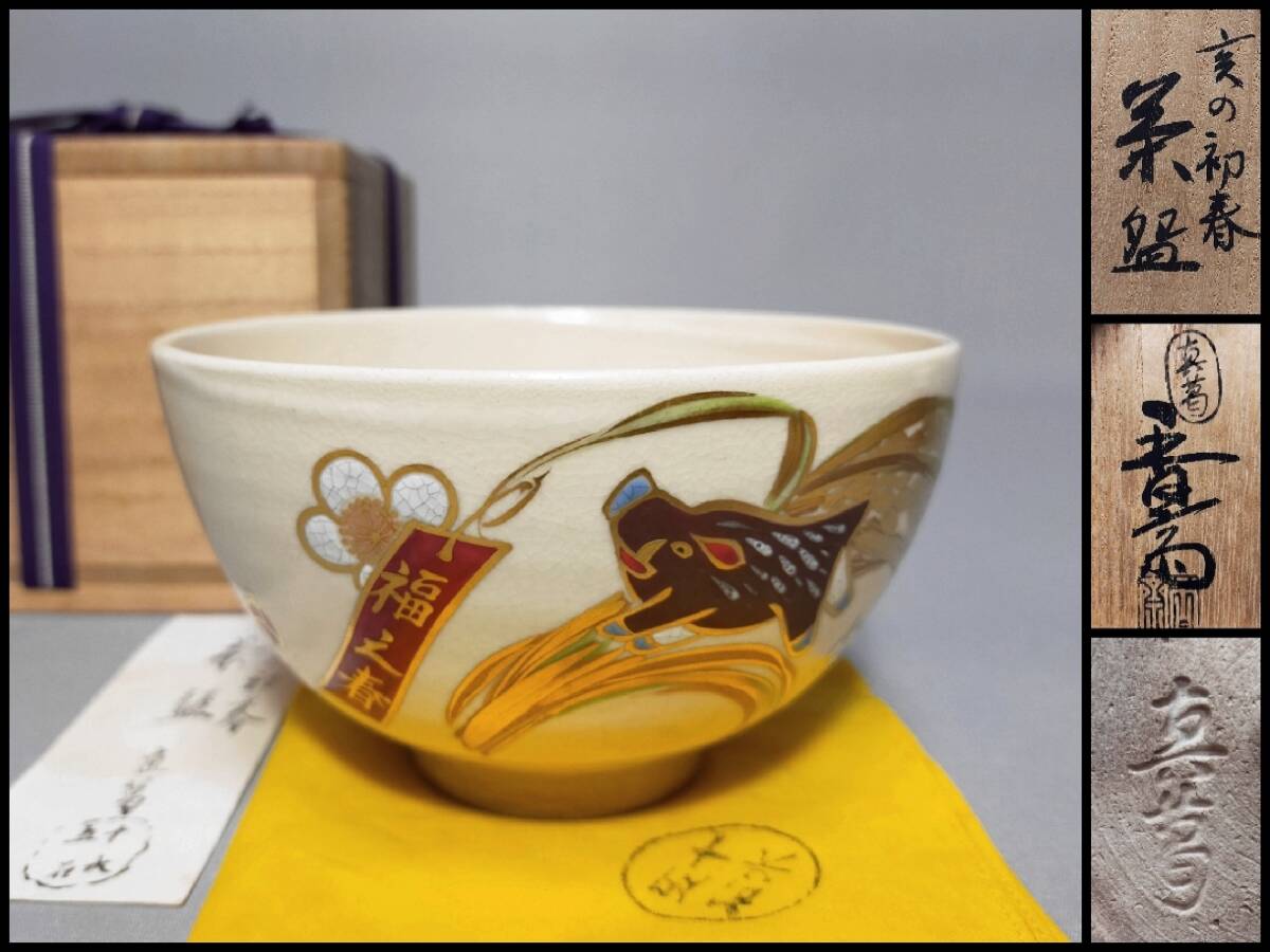 - FO29 真葛焼 茶碗 真葛香斎 (宮川香斎) 造 亥の初春 色絵金彩 福之春 共布・共箱 茶道具