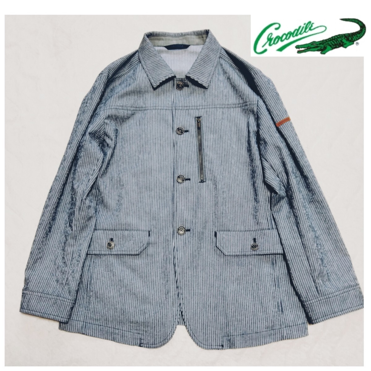 > 試着のみ*クロコダイル*カバーオールジャケット*ストライプ柄*カジュアル*メンズ*洗える*春夏*紺系*CROCODILE*ライトアウター*リネン混*麻