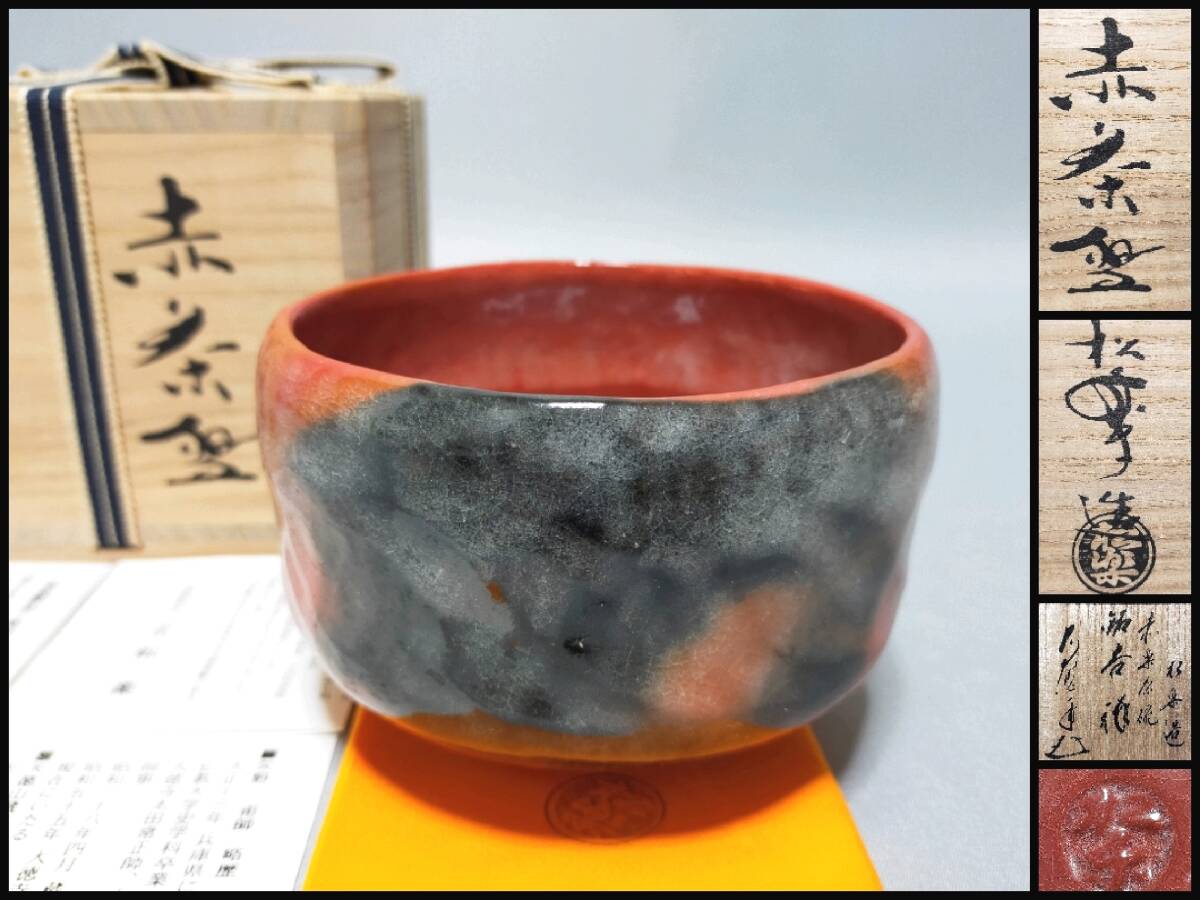 > FA29 楽焼 茶碗 三代 佐々木松楽 造 赤茶碗 大徳寺 矢野一甫書付 銘「吉祥」 栞・共布・共箱 茶道具