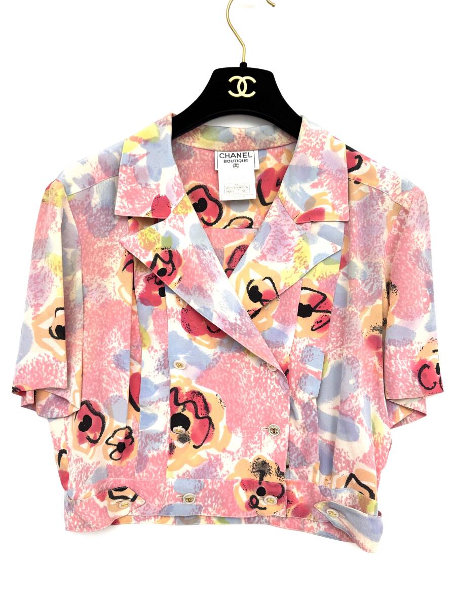 - 7B0205【本物保証】シャネル クロップド シャツ ジャケット 半袖 カメリア 柄 ココマーク ボタン #38 P07536 97P CHANEL