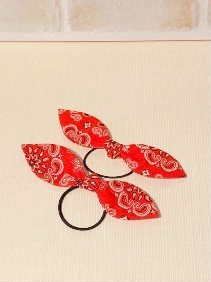 - ヘアゴム(D-39)うさみみ/ペイズリー柄/ハンドメイド/2個セット/赤色/ヘアアクセサリー/バンダナ柄