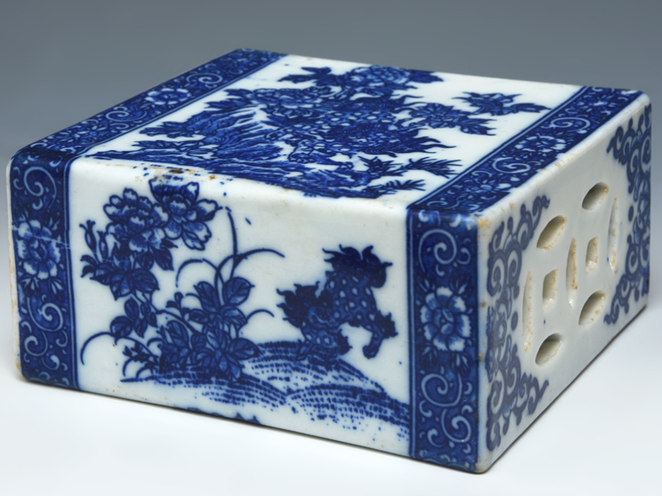 - 時代 中国美術 青花獅球枕 共箱 陶磁器 陶枕 香枕 大名枕 寝具 まくら 染付 獅子 牡丹 香炉 z9405a