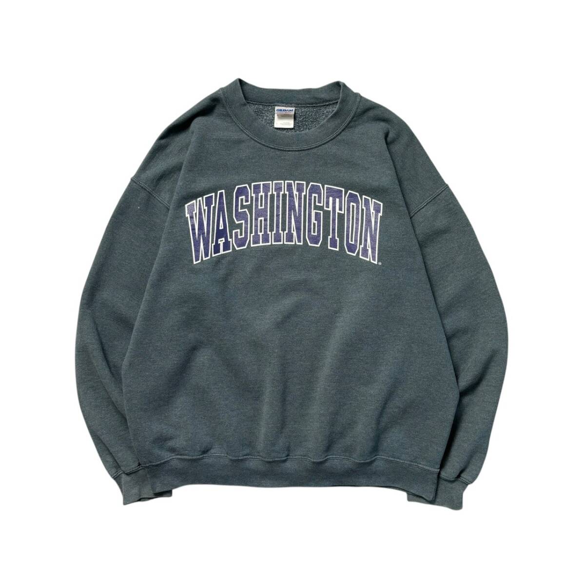 > Lサイズ 00s USA古着 GILDAN カレッジロゴ カレッジプリント スウェット トレーナー 裏起毛 ワシントン くすみカラー グレー