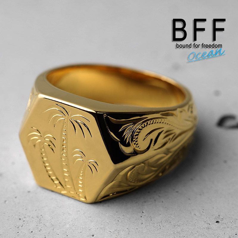 - (14号) BFF ブランド パームツリー 印台リング ラージ ごつめ ゴールド 18K GP 金色 手彫り 彫金 専用BOX付属