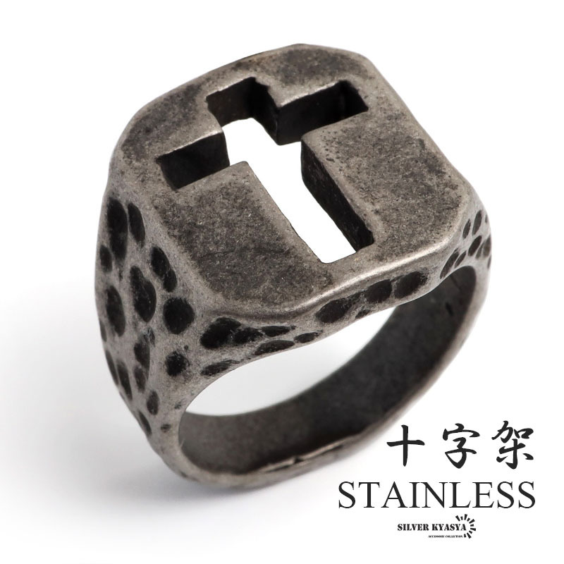 - (19号) ステンレス 印台リング クロスリング アンティーク シルバー 燻し 槌目 十字架 メンズ 金属アレルギー対応