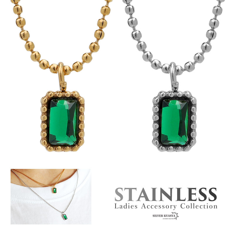 - (ゴールド) ネックレス ステンレス グリーン 緑 一粒ストーンネックレス ストーン 18KGP ボールチェーン 細身