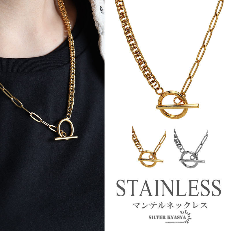 > (シルバー) マンテルチェーンネックレス ステンレス シルバー 18KGP 2way 切り返しチェーン 金属アレルギー対応