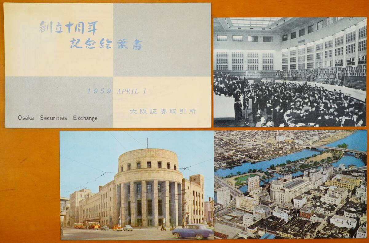 - 大阪証券取引所 創立十周年記念絵葉書 3枚 1959年 立会場見取り図 立会風景 本館正面 建屋空撮 検:大証 北浜 五代友厚 大阪株式取引所