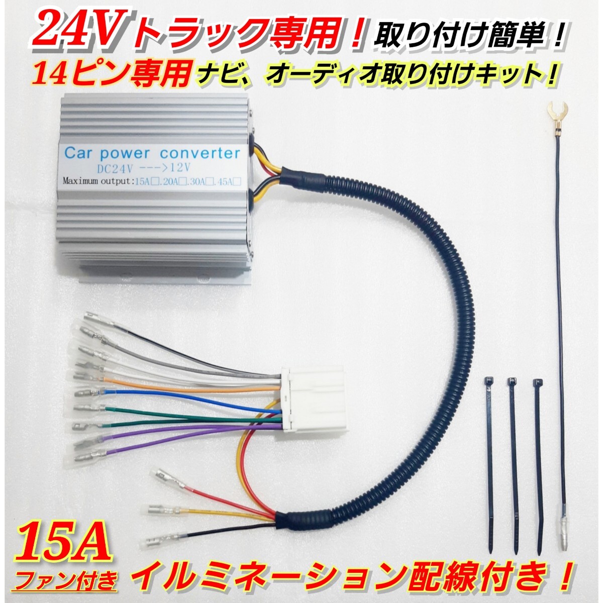 > ★14ピン15A★24Vトラック用!新品オーディオ、ナビ取り付けキット!24V→12V 電圧変換器 15Aデコデコ!日野、ISUZU、三菱ふそう、UD