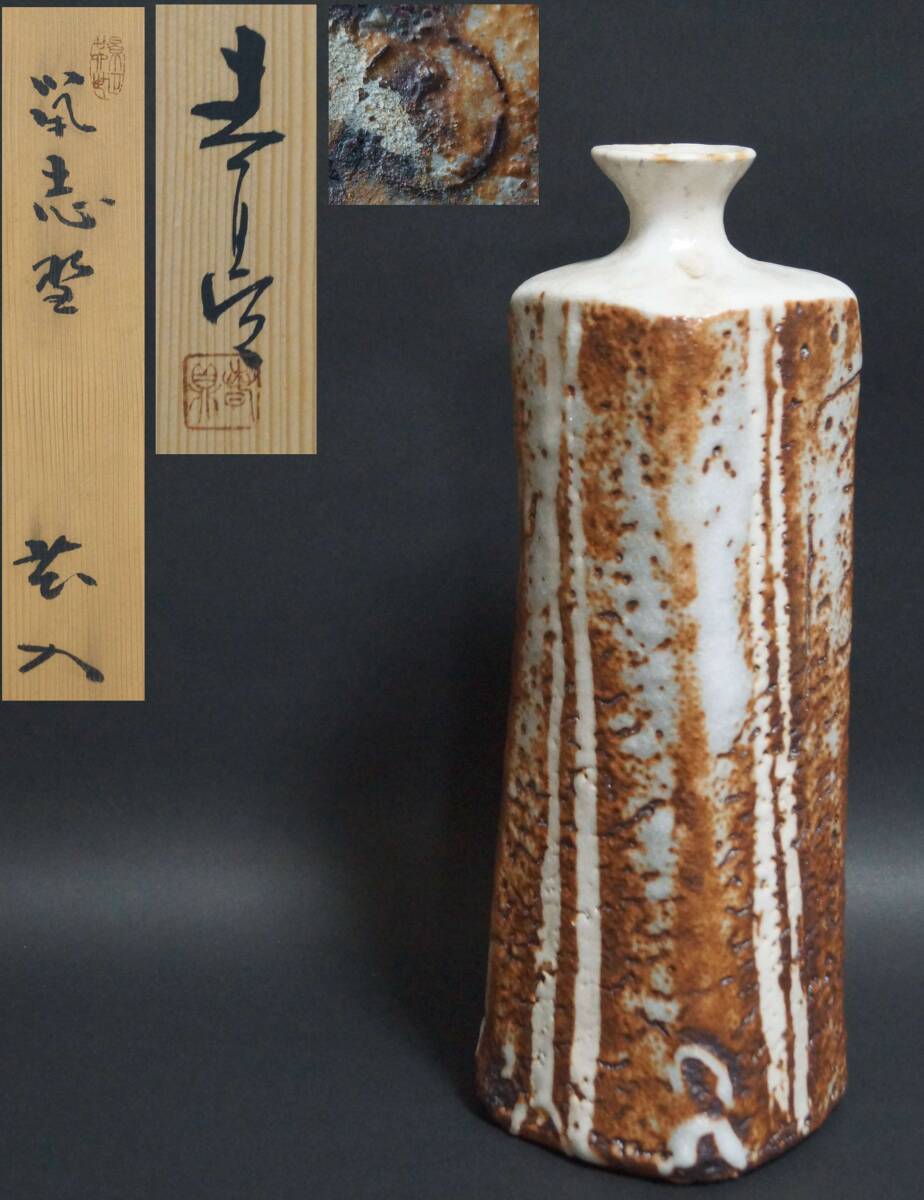 > 【閑】茶道具 二代 加藤春鼎 (造) 鼠志野 大型造形面取花入 花瓶 花器 花生 高さ32㎝ 共箱 華道具 志野焼★時代物★7D0208