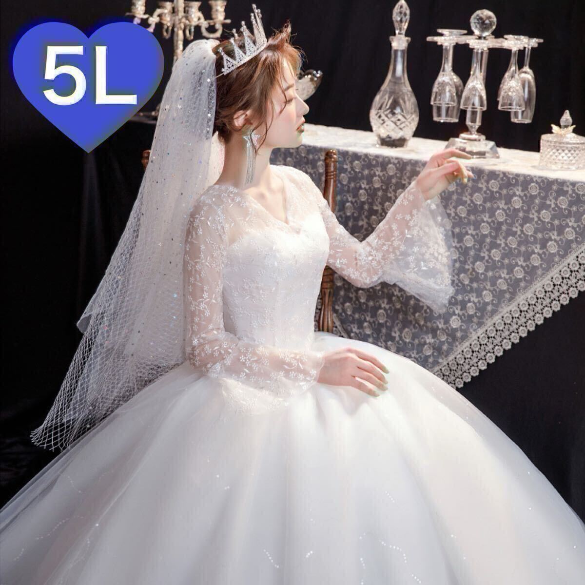 - ウェディングドレス Aライン ホワイト 白 5L 4XL ロングドレス ブライダル 花嫁 シンプル 袖あり 長袖 プリンセスドレス XXXXL コルセット