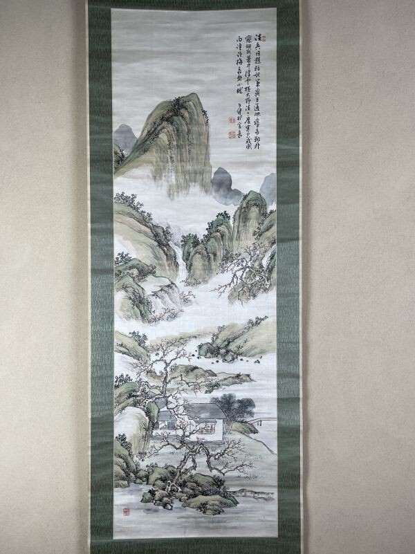 - 【真作】T》豊後南画 平野五岳 絖本 春景青緑山水図 共箱 名品 K277ニシlf