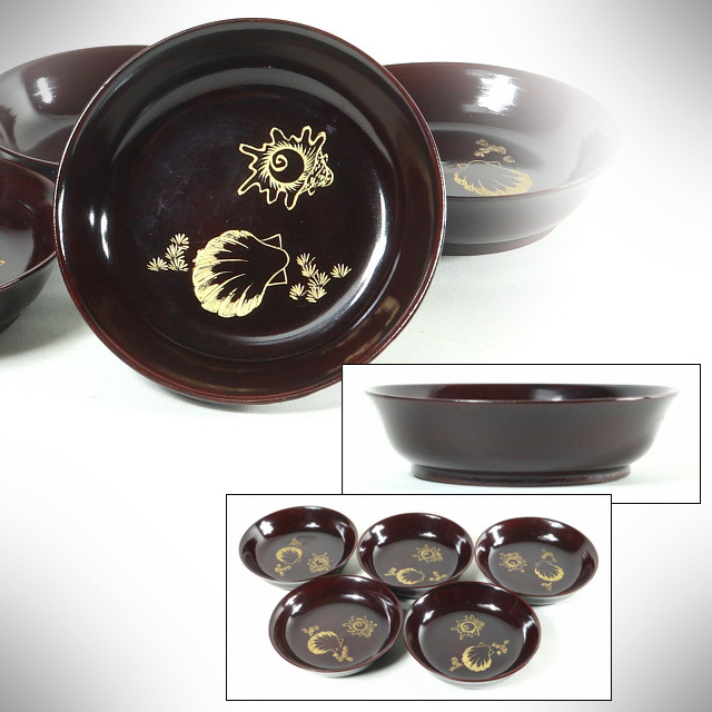 ●b2866●時代【沈金菓子皿5客 貝づくし紅溜明治期】検お茶会煎茶道具茶懐石道具吸皿酒木皿つまみ皿取り皿輪島塗●西瓜●