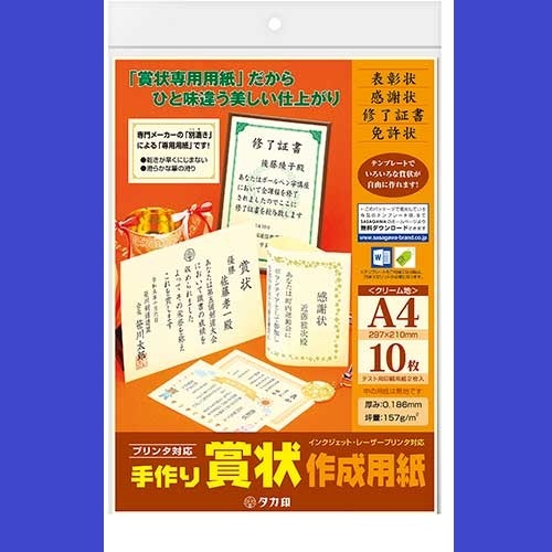 - ササガワ 手作り 賞状作成用紙 A4判 クリーム 10-1967 1パック★未開封品・送料無料★