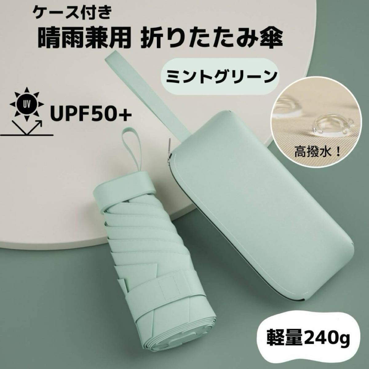 - 折りたたみ傘 晴雨兼用 ミントグリーン ケース付き コンパクト 軽量 240g