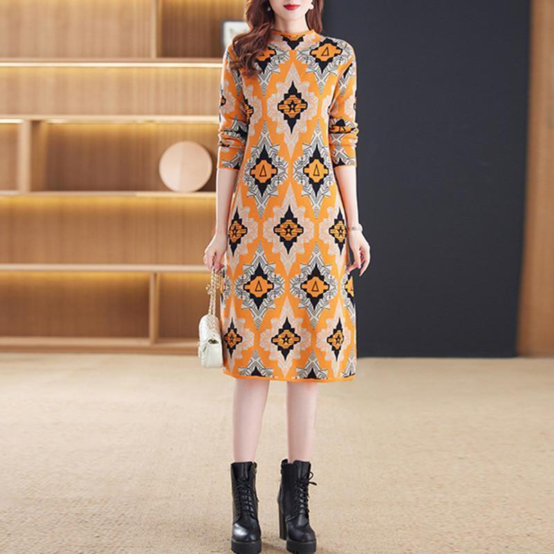 - 【ブラック&オレンジ色★Lサイズ】長袖 ひざ丈 ニットワンピースおしゃれ