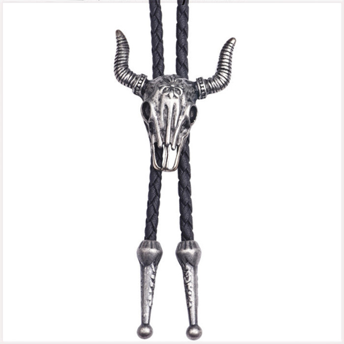 - [Fashion] Bolo Tie ヴィンテージ 雄牛ヘッドスカル カウボーイ ループタイ 紐ネクタイ レザーロープタイ ボロタイ (Silver)【送料無料】
