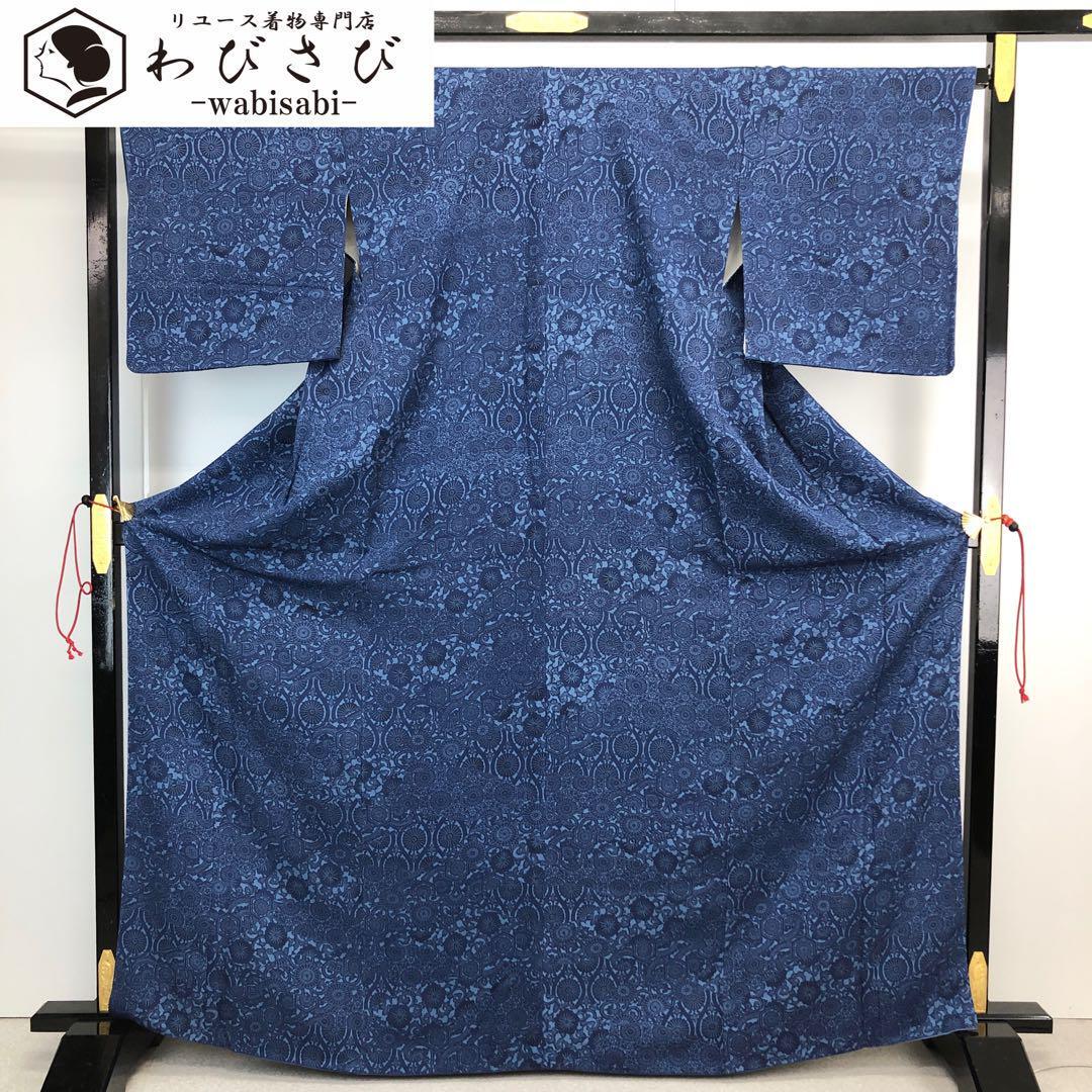 - 小紋 型染 花唐草模様 藍色 縮緬 トールサイズ K-4385 着物 きもの kimono 和服 和装 中古 リサイクル着物 【送料無料】
