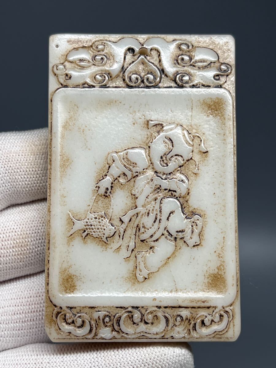 - 時代物 中国古美術 和田玉 浮彫 巻雲紋 漢詩 子岡牌 根付 旧蔵 コレクション