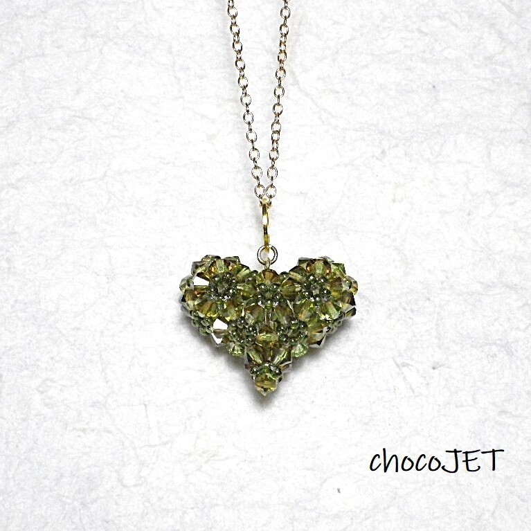 - チェコビーズ・クリスタルハートネックレス カーキグリーンオリーブ 緑色