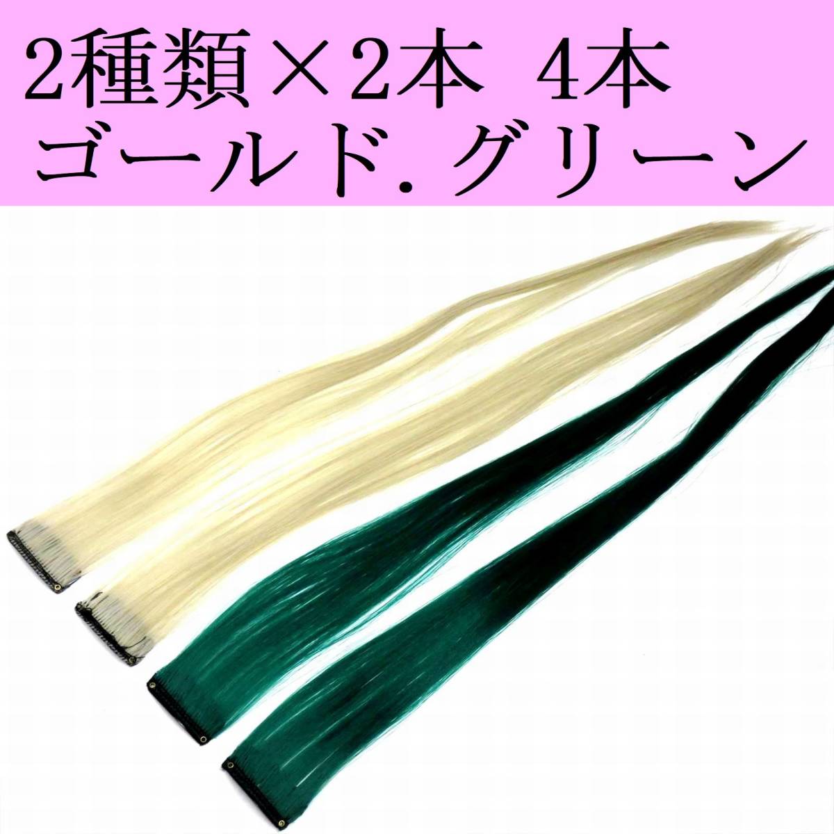 > ワンタッチカラーエクステ ストレート 2種×2本 4本セット ゴールド グリーン 長さ54cm ロング 金 緑 ウイッグ アレンジ コスプレ メッシュ
