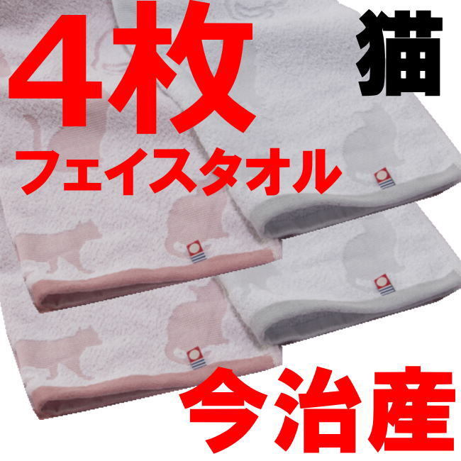 - 4枚 今治タオル フェイスタオル 猫 ネコ ピンクとグレー 今治 タオル綿100