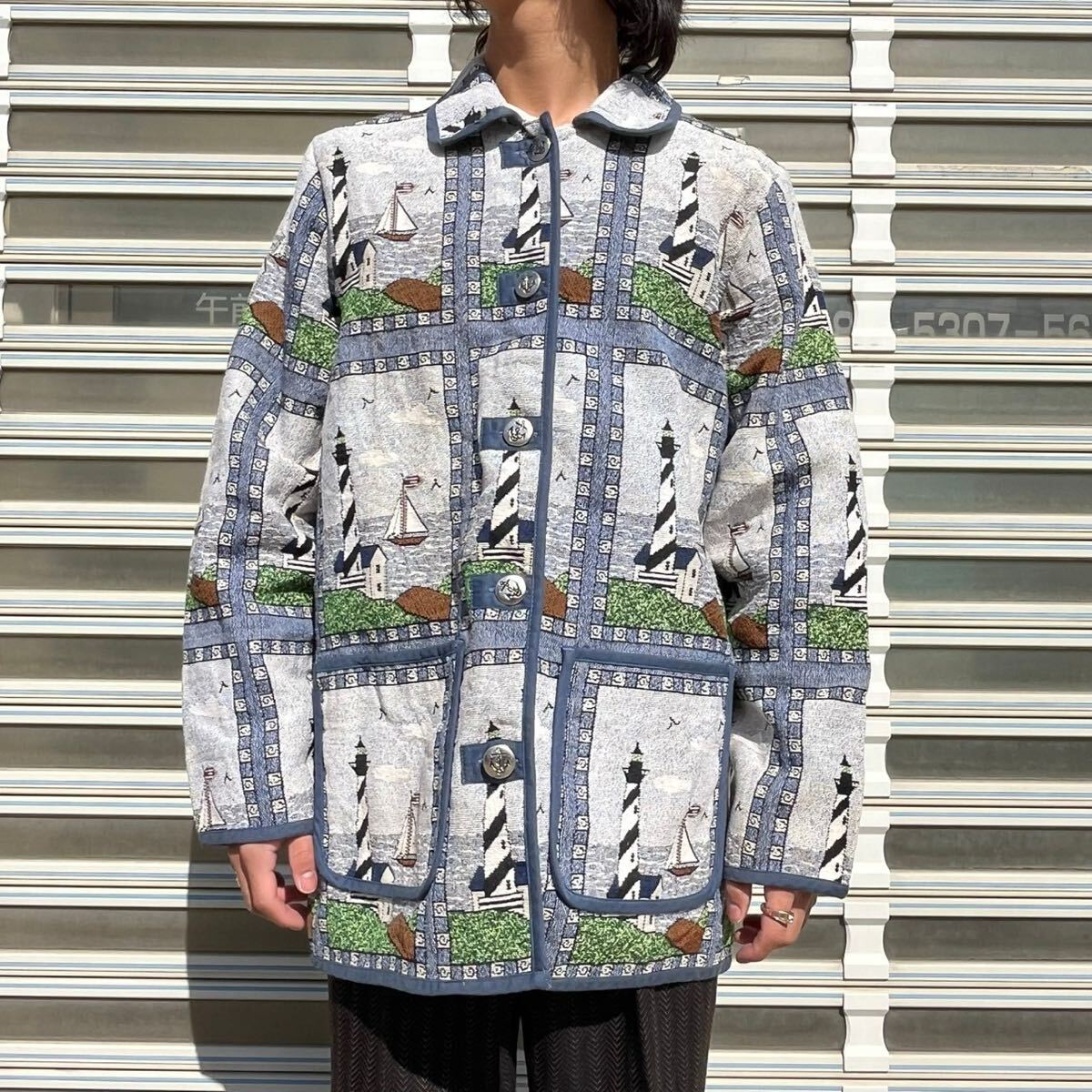 > 90s BLAIR 総柄 ゴブランジャケット 灯台 アメリカ古着 アメカジ L ヴィンテージ ブルゾン ジャガード 00s イカリボタン