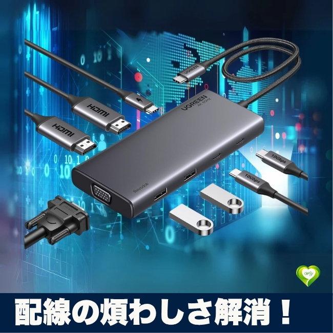 > 【配線の煩わしさ解消!】UGREEN USB Cハブ ドッキングステーション 3画面出力 8 in 1 2*HDMI出力 VGA 10Gbps USB C A おすすめ 人気 便利