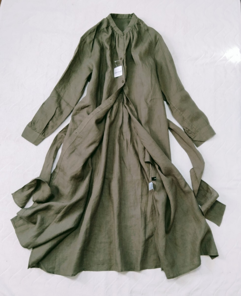 - 未使用*元町ゼラールスポーツ* Zelal Sports*リネン100%*フレアワンピース*ウエストリボン*ロング丈*カーキ*麻*サイズ11*長袖*前ボタン