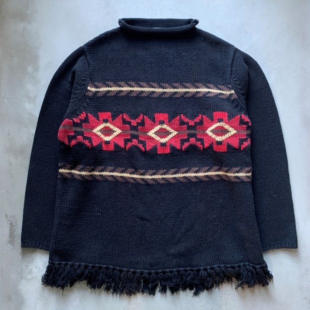 - 【M】JONES NEW YORK ロールネック フリンジ コットンニット セーター ブラック 黒■ビンテージ オールド アメリカ古着 90s ネイティブ柄