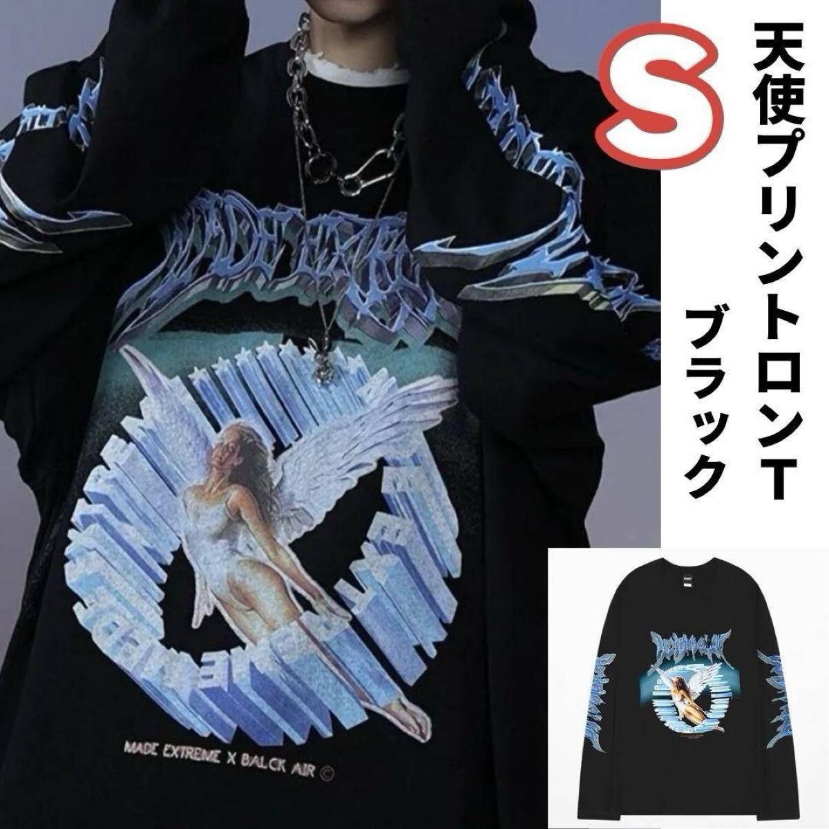 - オーバーサイズ ロンT 天使プリント ブラック S 韓国 ストリート
