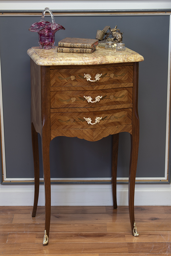 ほんのり赤みがかったローズウッドの美しい寄木模様に 引き出し前面には花の象嵌と、大変可憐にまとまったお品。綺麗に磨きなおした引き出し取手と足元の小さなブロンズがアクセントになり、さらに上品な印象に仕上がっています。