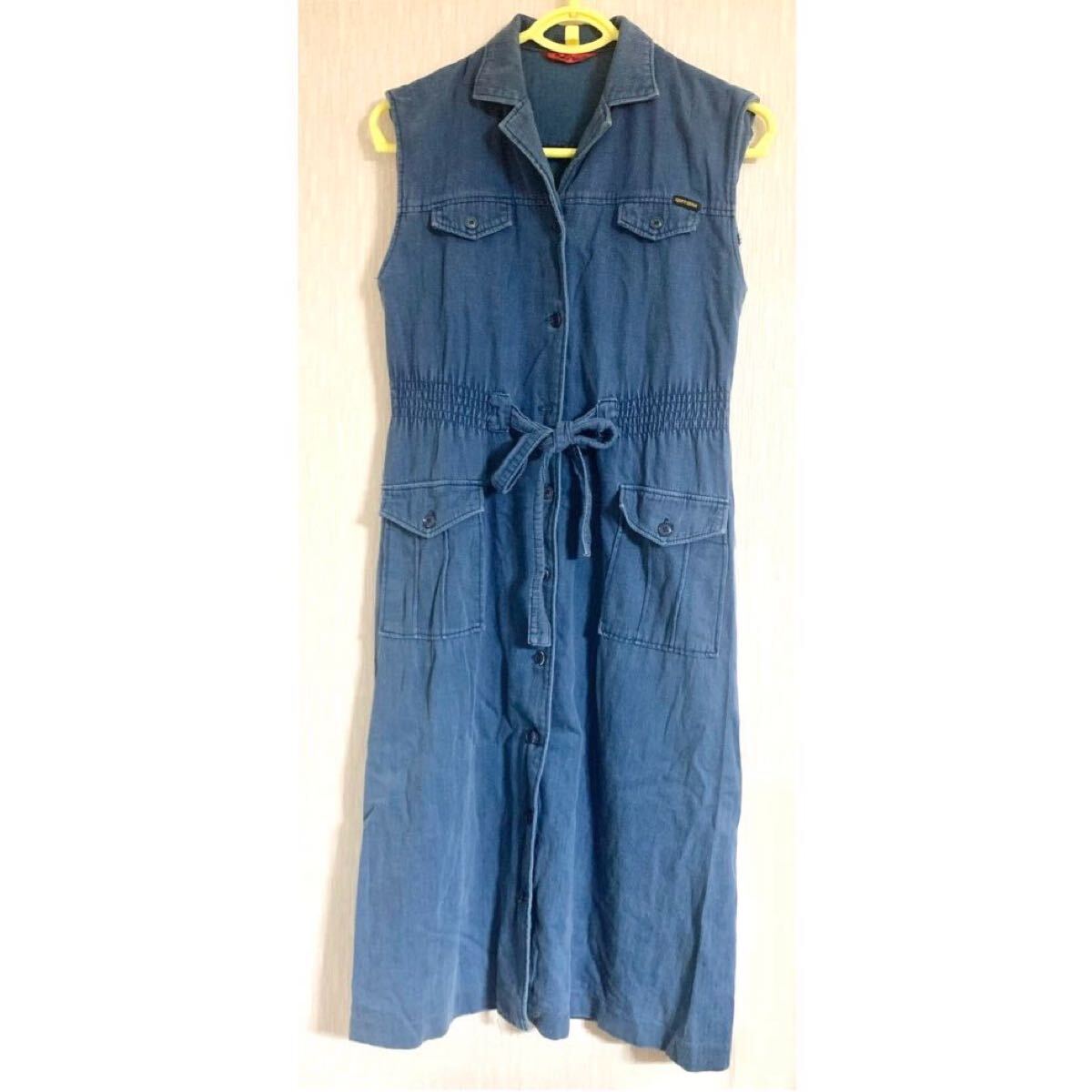 - 匿名配送 ノースリーブ無地デニムワンピース 開襟 ブルー 青 ウエストリボン インディゴブルー ひざ丈 綿 コットン