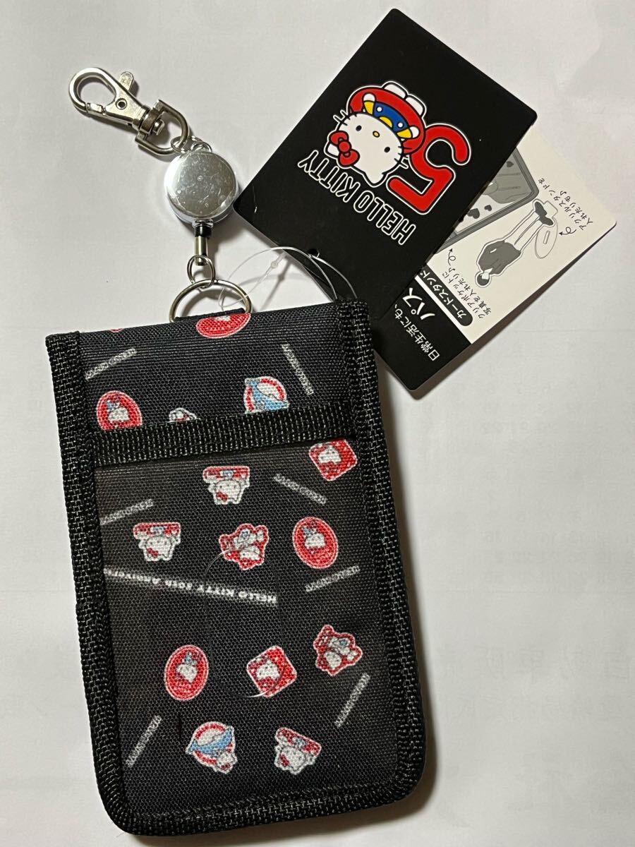 - ハローキティ50周年 リール付きパスケース 定期入れ カードスタンド マグネット付き ブラック 黒 歴代デザイン