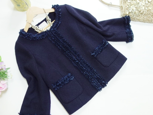 - ボンメルスリー Bon mercerie/ワールド★フリルジャケット★サイズ36/7~9号位★ウール混★紺/ネイビー色★日本製★シュートコート
