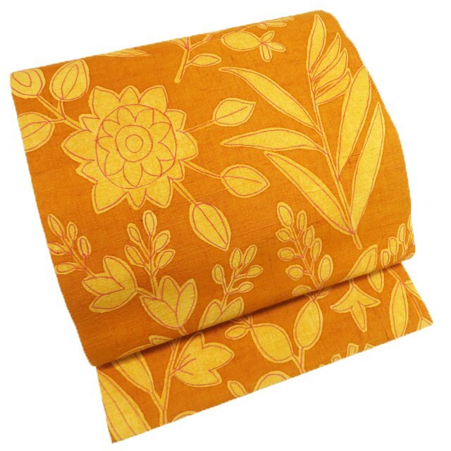 > 名古屋帯 なごや帯 中古 リサイクル 正絹 紬地 カジュアル 仕立て上がり 刺繍 花模様 蜜柑色 多色 きもの北條 A1155-9