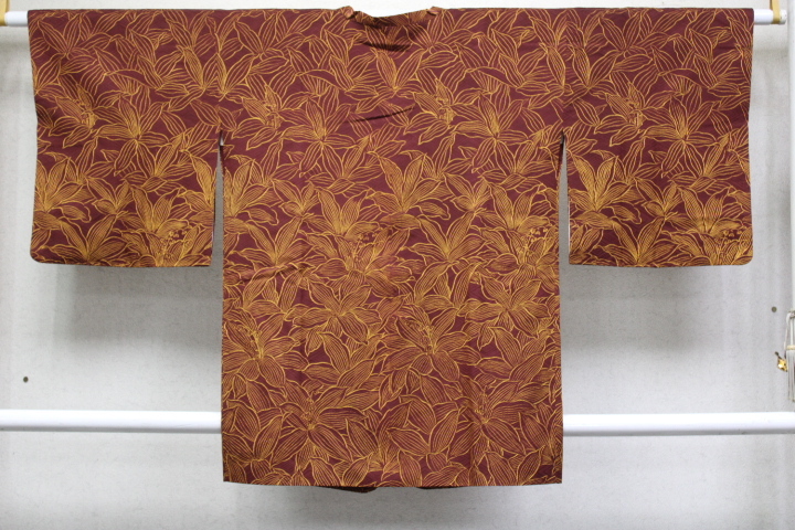 - きもの今昔8290 道行コートコレクション 正絹綸子地 レンガ茶色地木の葉蝋彩染め コート丈84cm