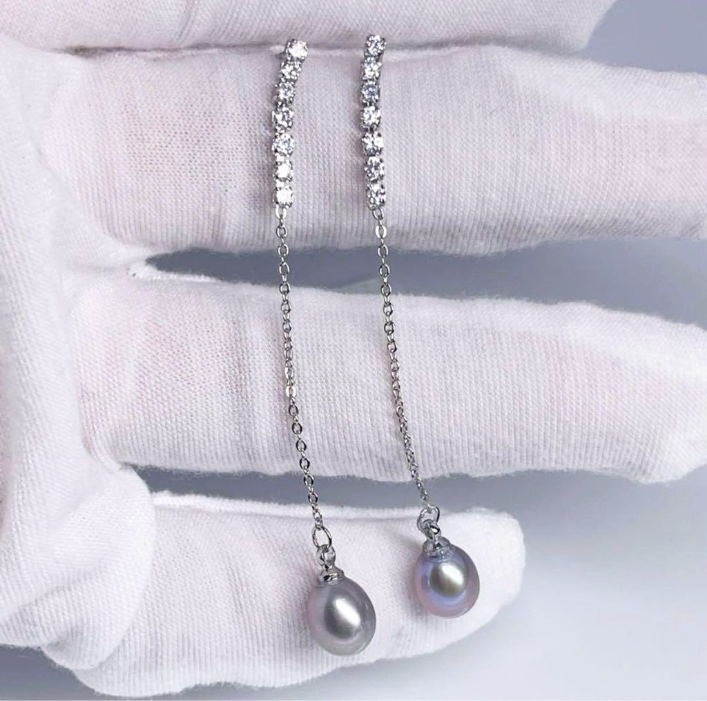 - 花珠級 本真珠 パールピアス 7mm グレー系 パープルメタリック ダイヤモンド