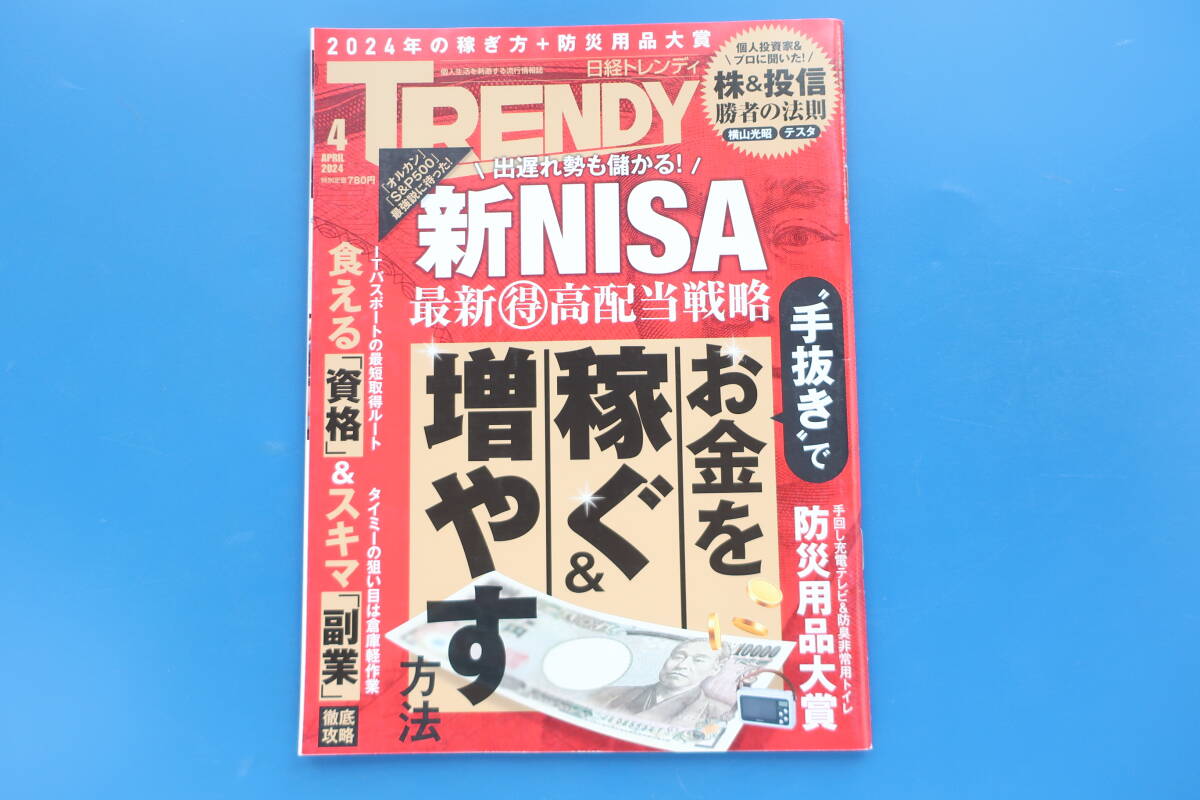 > TRENDY/日経トレンディ/2024年4月号/保存版解説/特集:新NISA/お金を手抜きで稼ぐ&増やす方法/高配当戦略/食える資格/副業/防災用品大賞